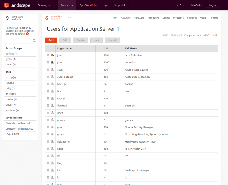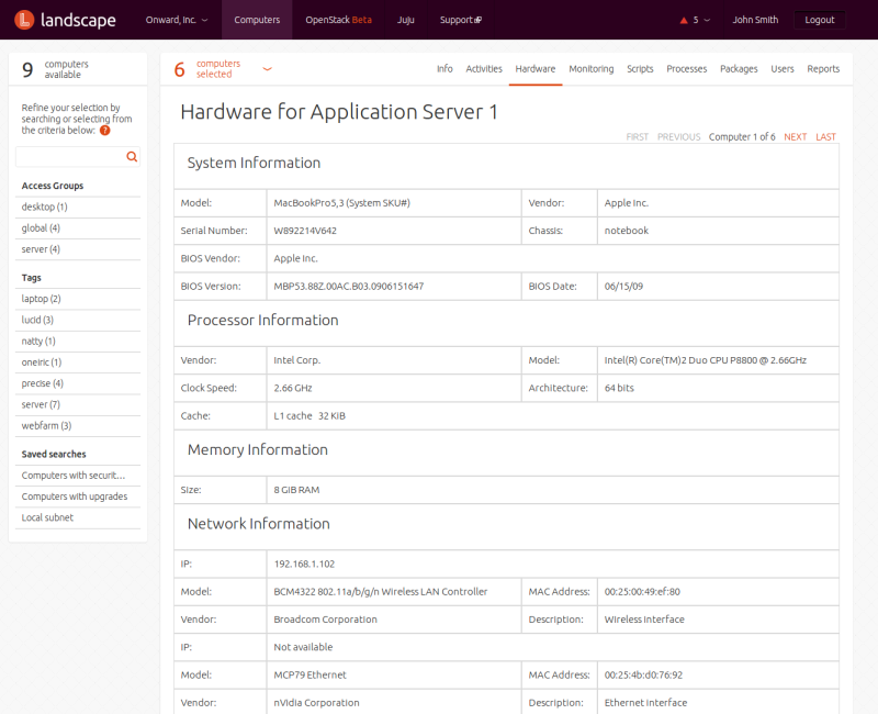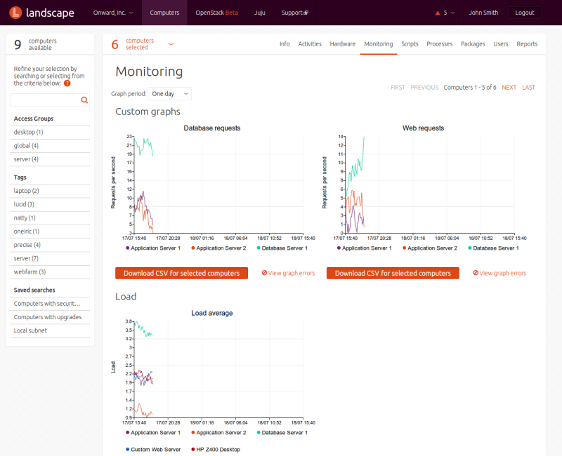 You can select one or more computers individually, or by using searches or tags. For each of those approaches, the starting place is the menu entry at the top of the screen. Clicking on it displays a list of all computers Landscape knows about.