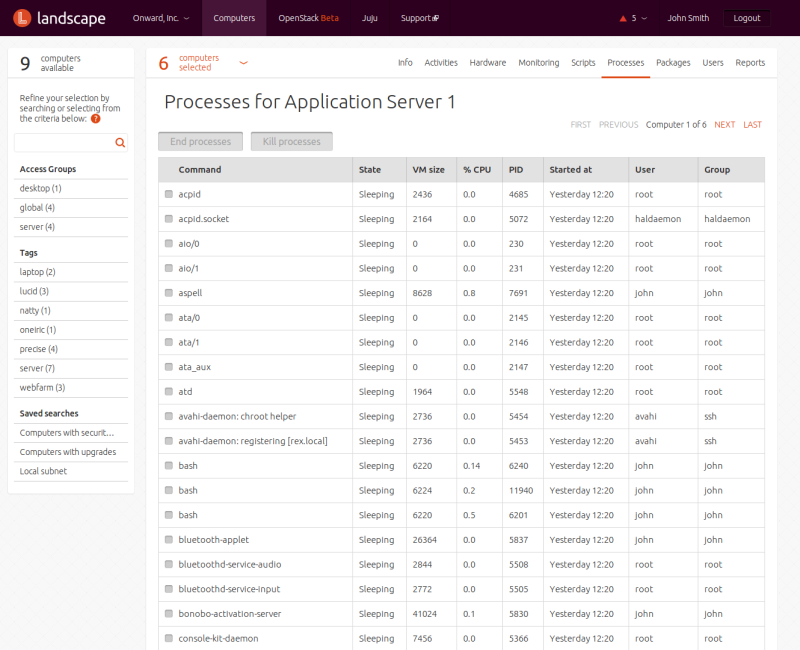 Clicking on displays information about all processes running on a computer at the last time it checked in with the Landscape server, and lets you end or kill processes by selecting them and clicking on the relevant buttons.